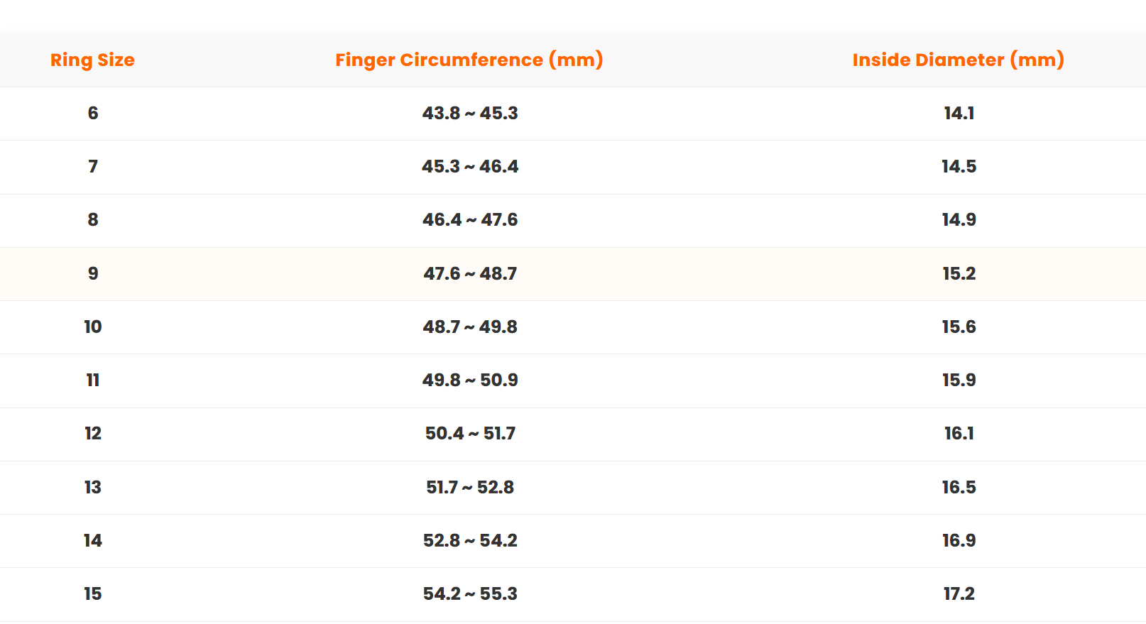 | Ring Size | Finger Circumference (mm) | Inside Diameter (mm) |